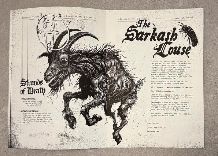 A Damned Hermit‘s Grimoire is a mini, black and white zine compatible with Mörk Borg.