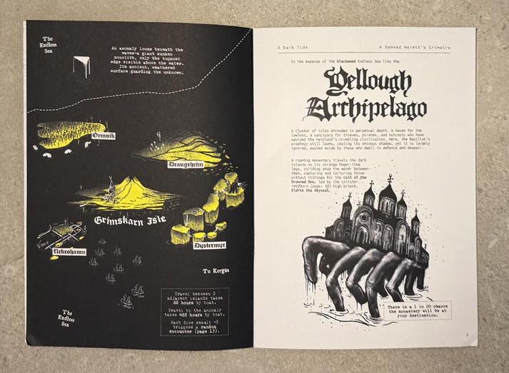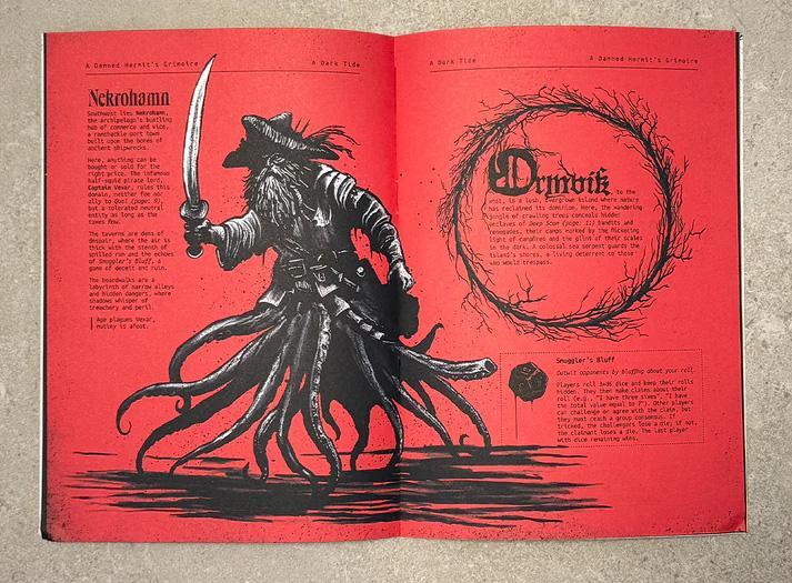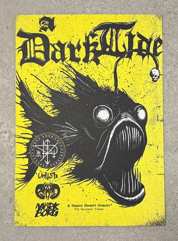 A Dark Tide is a mini, black, red, yellow and white, zine compatible with Mörk Borg. 2nd in a series, The Damned Hermits Grimoire, but completely stand alone (you don't need the first). It includes a collection of;