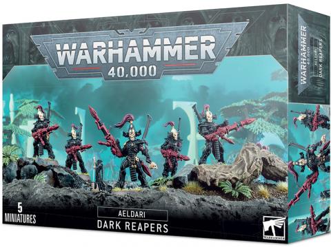 This kit builds one unit of Dark Reapers armed with reaper launchers, complete with their Exarch who can be built with a reaper launcher, shuriken cannon, aeldari missile launcher, or tempest launcher. The Exarch can be built holding a skull in their off-hand, and has a choice of four heads, while each Dark Reaper has a choice of helmeted or unhelmeted heads. Also included is a small miniature representing a Dark Reaper shrine.