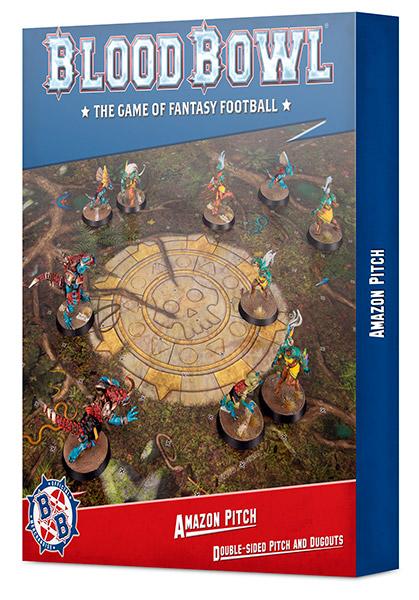 One side of the pitch is a dense jungle floor littered with poisonous serpents, featuring a prominent Amazon Team icon in the centre. On the other side, torrential rainfall has flooded the pitch, attracting the colourful birds and great scaled beasts native to Lustria.