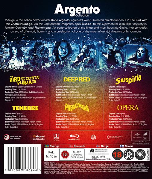 Bird with a crystal plumage (1969), Deep Red (1975), Opera (1987), Phenomena (1985), Suspiria (1977) och Tenebre (1982).