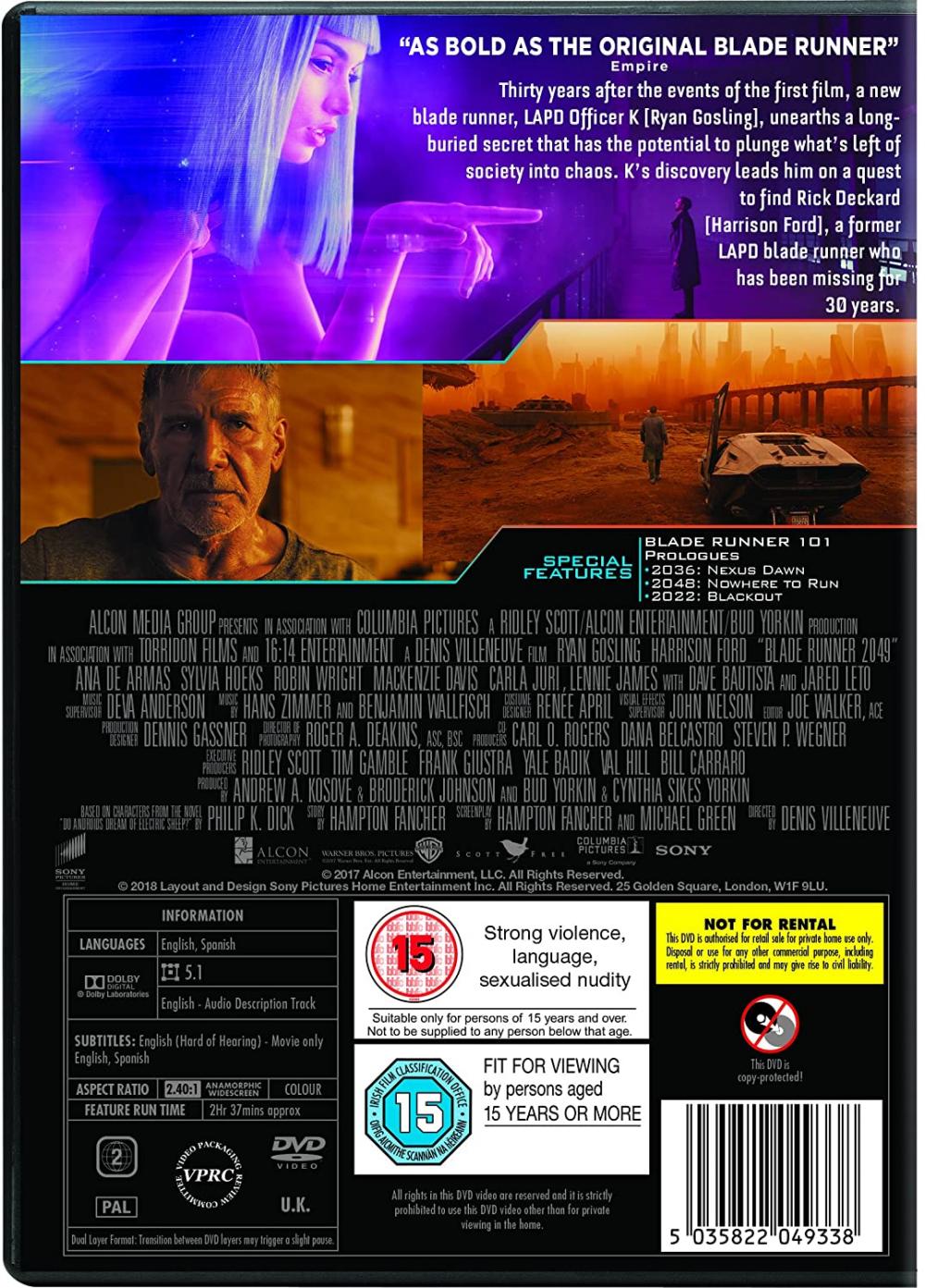 - Skådespelare: Harrison Ford, Ryan Gosling, Ana De Armas, Dave Bautista, David Dastmalchian, Jared Leto, Mackenzie Davis, Robin Wright