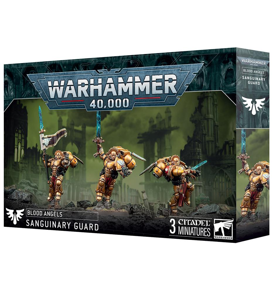 This multipart plastic kit builds three elite Sanguinary Guard for your Blood Angels army. Their signature muscle-sculpted armour sets them instantly apart, along with mighty jump packs, and their long swords and spears complete the image of peerless angelic warriors. Each of the three miniatures has both a bare head and a helmeted version wearing an eerie death mask. They all have the option to wield a sword or spear, and one can be equipped with an inferno pistol and another can attach a Sanguinary Banner to his spear.