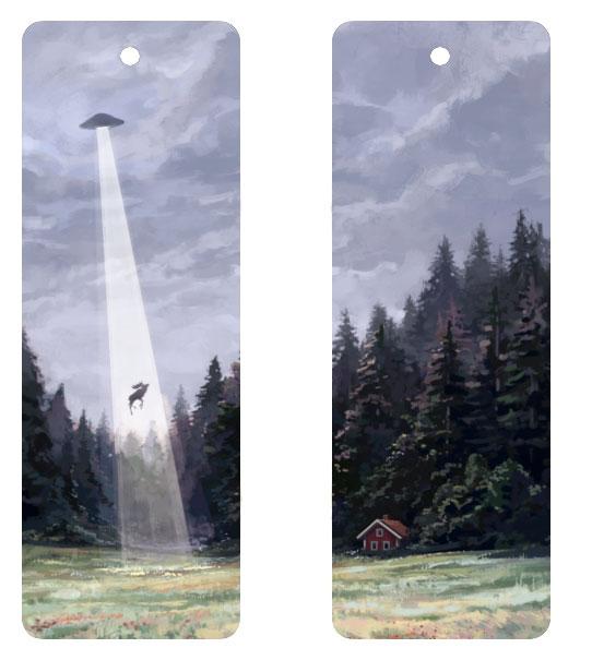 Snyggt bokmärke med röd stuga i granskog och älg som strålas upp av ett flygande tefat. Perfekt för att märka upp var i boken du ligger, oavsett genre!
