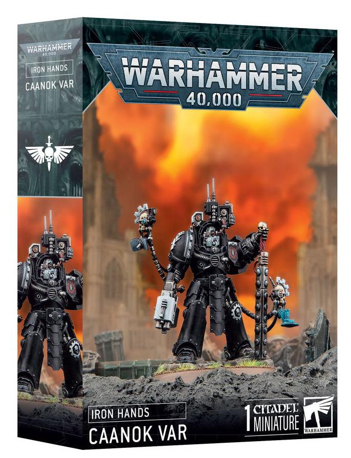 This multipart plastic kit builds Caanok Var, a cold and calculating leader for your Iron Hands Space Marines armies in games of Warhammer 40,000. Clad in custom Terminator armour, he is a tough target to kill, and his fury in melee as he swings his devastating power maul, or aims his storm bolter, will make your enemies regret facing him. Gamers will love the destruction he causes on the tabletop. Painters will appreciate the details, including a pair of servo-skulls providing tactical information and various augmented body parts, such as a bionic eye, heart, and the obligatory iron hand.