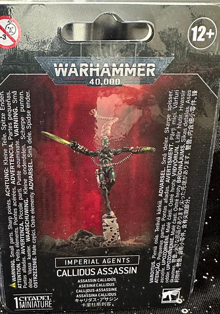 This multipart plastic kit builds a Callidus Assassin, a shapeshifting Imperial Agent deployed to undermine and eliminate enemies of the Imperium. Clad in a synskin bodyglove, the Callidus is an acrobatic killer armed with a C'tan phase blade and a neural shredder pistol, as well as a selection of poisoned blades strapped to their thigh.