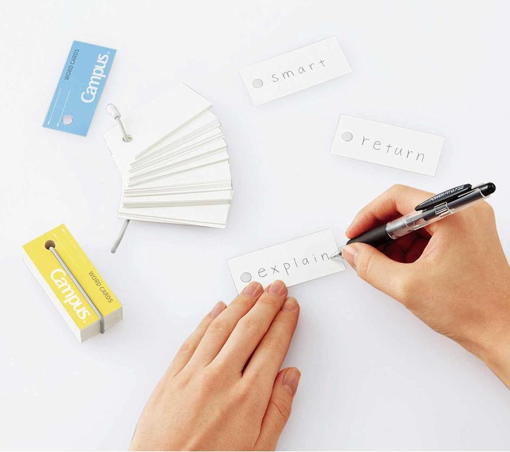 Hållare med kort för att skriva upp ord på annat språk att träna på. Gult utförande.