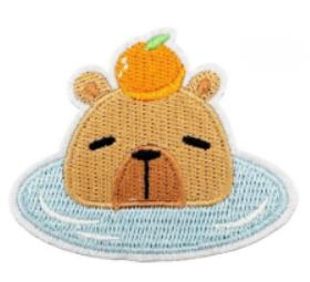 Tygmärke föreställande sydamerikansk vattengnagare med frukt på huvudet.