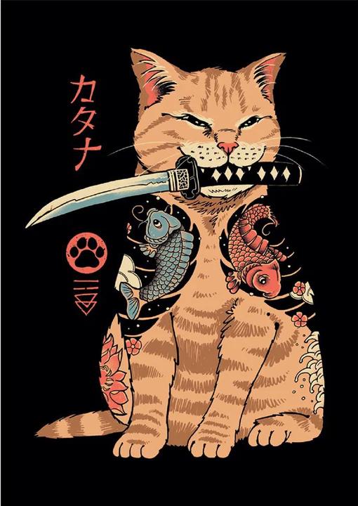 Vykort med "kattana"-motiv, det vill säga en lurig, tatuerad bondkatt med kniv i munnen.