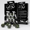 This dice set is kept in a bottle-green & gold color theme. The digits on these dice have cat's ears and are accompanied by yarn balls, milk bowls, and cat's paw trails! Each dice presents a different type of cat silhouette on its highest face!