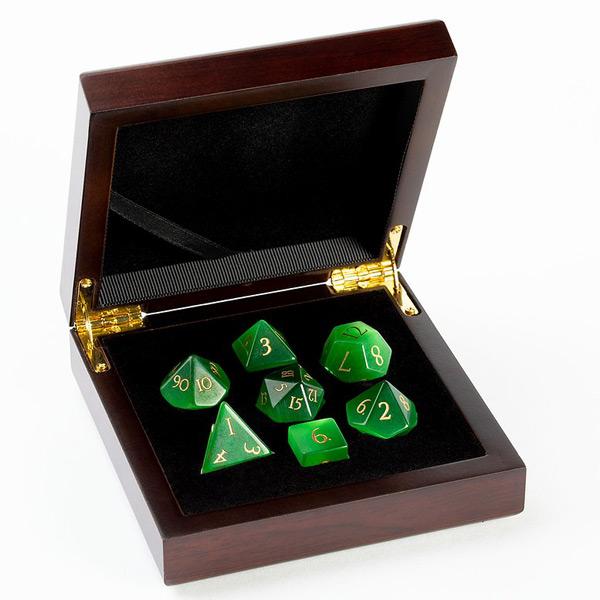 The Greifenfels Stone Series are cut from semi precious stones. This set contains seven 16mm-dice: D20 D12 D% D10 D8 D6 D4. Due to the material these dice can be brittle. We recommend using a dice tray.