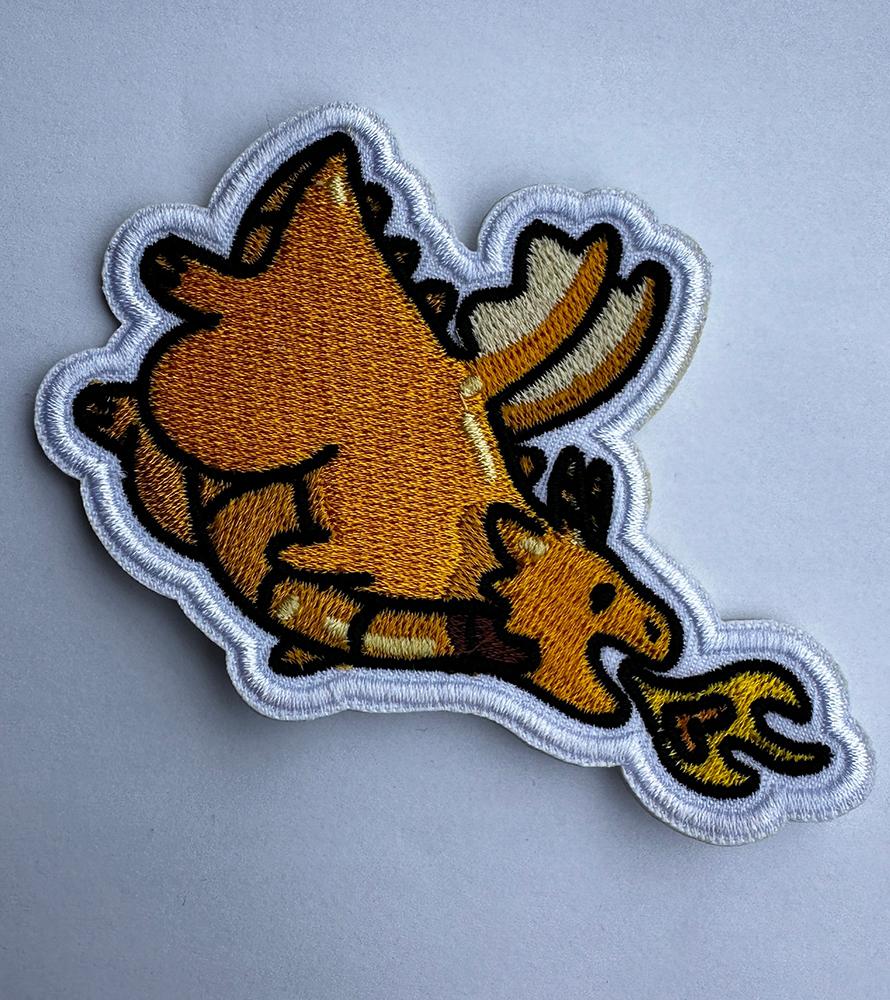 Tygmärke av mullig gul drake. Stryks på med strykjärn, textillim eller små stygn. Kan tvättas i 30°.