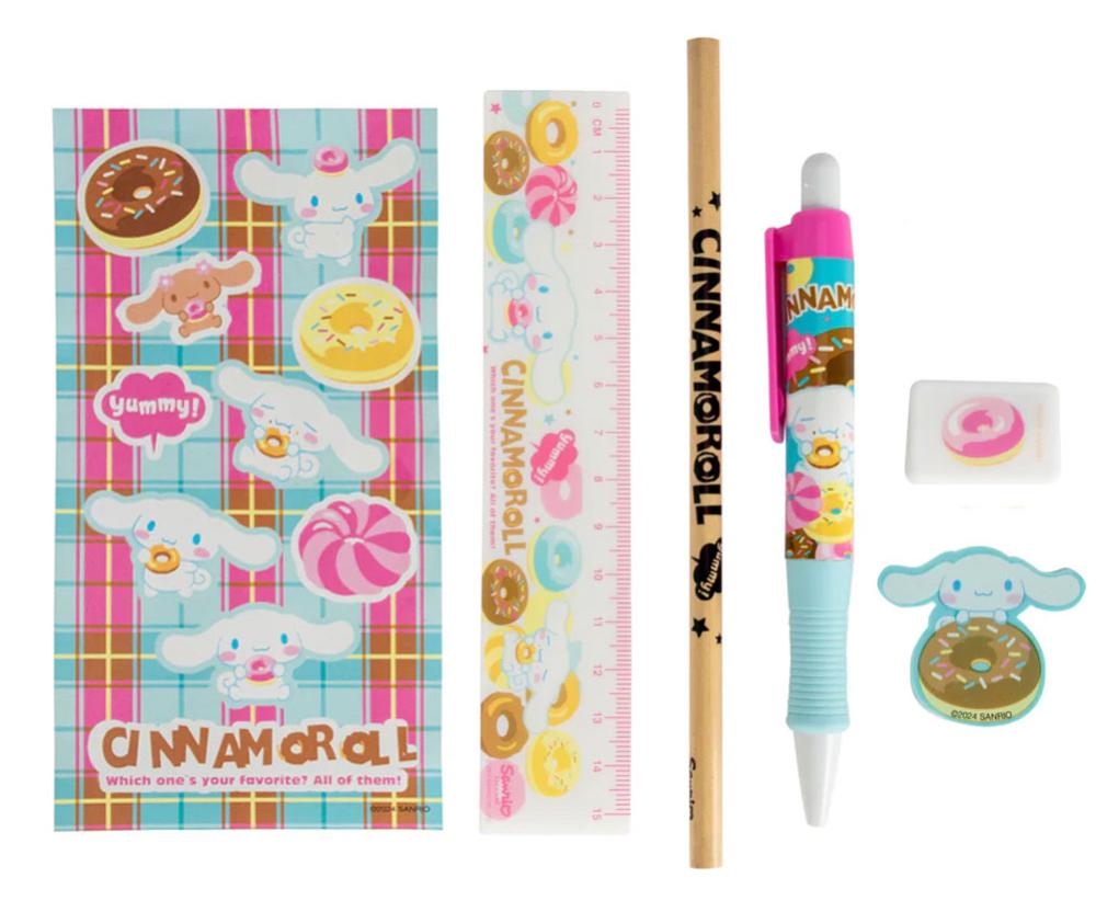 Bedårande Cinnamorollset med en 15 cm linjal, en blyertspenna och pennvässare, en bläckpenna, ett suddgummi och tio klistermärken.