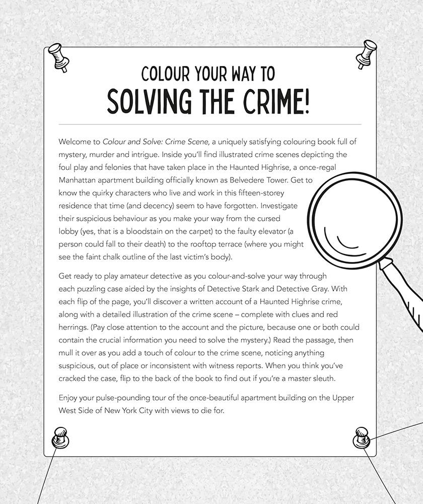 Test your detective skills with this uniquely immersive colouring book. Each page offers a brand-new story of murder and mayhem along with a colour-in crime scene full of clues. Whether it’s a forged will, stolen jewels, or a séance gone wrong, it’s up to you to solve the riddle: Read the case file, colour the crime scene, dodge the red herrings, and catch the villain . . . if you can.
