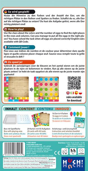 Columbus' Egg requires logical thinking! The eggs must be placed on the correct squares according to the laying rules. The indications in front of the rows and below the columns give hints on how many eggs of which colour are to be placed in which area of the game board. But the tasks become more and more diffi cult! The logic game Columbus' Egg offers a total of 40 different tasks in 4 diffi culty levels. Can you manage to solve all the tasks? Start with an easy puzzle and work your way up to the more diffi cult ones. If you get stuck, you can look in the solution booklet.