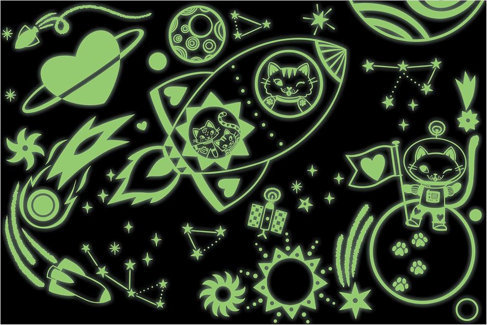 100-bitars pussel med ett färgglatt motiv av katter i rymden. När pusslet är färdigt kan du släcka lampan och se en överraskning, rymden lyser i mörkret!