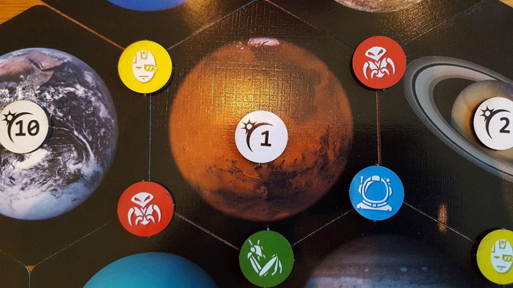 The solar system consists of 12 planets, each of them surrounded by six grid points where battle stations may be placed. Some grid points border several planets, hence making their battle stations more powerful. You claim a planet if you have the most battle stations at the end of a round. You win if you claim 3/4/5 planets (5/4/3 players).