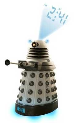 Alarm clock shaped like the White Supreme Dalek. Projects digital time and logo (with a focus adjustor on top). Blue LCD at the base displays digital time. Alarm sounds include Dalek gun, hover, and the classic "Exterminate!" sound effects. Speech indicator flashes white. Powered by 4x AA batteries (included). Size: 5-1/2" x 3" x 8" (14 cm x 7.5 cm x 20 cm)
