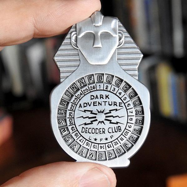 Our custom decoder badge will allow you to decode secret messages artfully hidden in Dark Adventure shows and elsewhere. This invaluable tool is inspired by "decoder rings" of the pulp era and lets you in on a world of bygone fun. No previous experience in cryptography is necessary.