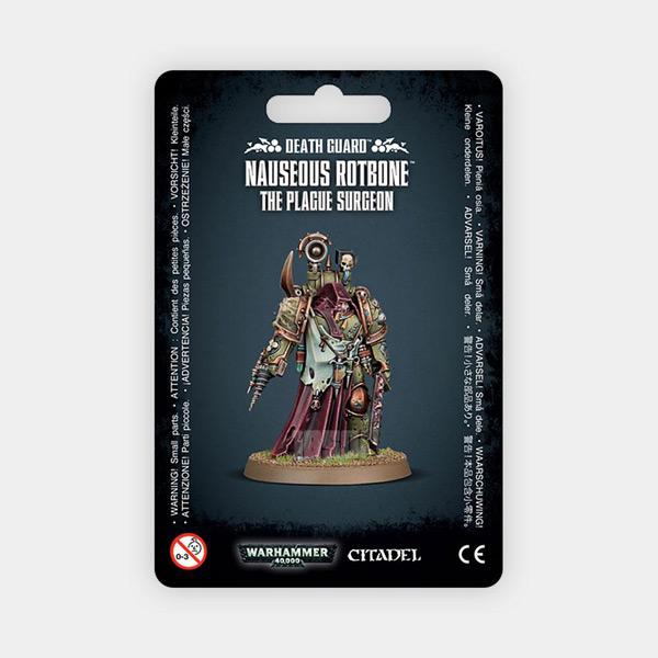 This multi-part plastic kit contains the components necessary to assemble Nauseous Rotbone, a Death Guard Plague Surgeon. He carries a bolt pistol and balesword, but where the real fun lies is in the various corrupted medical instruments he carries - narthecium-like instruments containing horrific plagues are all over his armour, with an ancient, rusted reductor perfect for stealing gene-seeds on his right arm. Much of his armour is concealed by a cowl and cloak, but the armour that is visible is covered in the pits, rust and corrosion expected from such a devotee of the Death Guard. His right shoulder bears a vile plaguebearer's head, and the device on his back. the less said about that, the better.