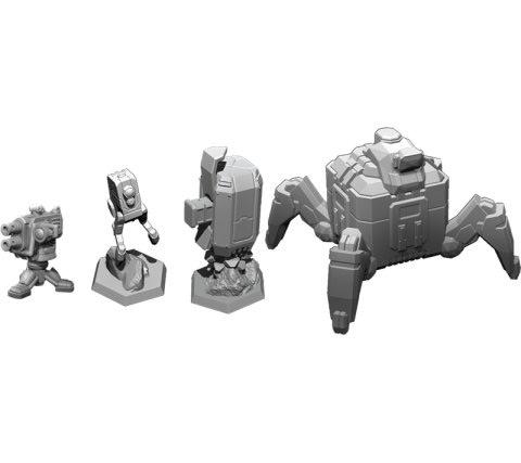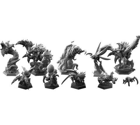 1 game board, 14 engraved dice, 115 linen cards, 120 tokens, 45 minerals, 1 swarm threat marker, 40 health and damage tokens, 1 rulebook, 1 mission book, 43 cave segments, exits, pits, and drop pod, 4 double-layered character boards, 4 special miniatures, 4 unique dwarf miniatures, 38 glyphid miniatures, 7 stalagmite miniatures.