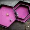 This is a sturdy dice tray in faux leather, lined with violet felt. The tray has a compartment inside that makes it easier to sort your dice, while the lid can be used as a bigger tray. On the outside of the Lid is a big print of a dice cauldron.