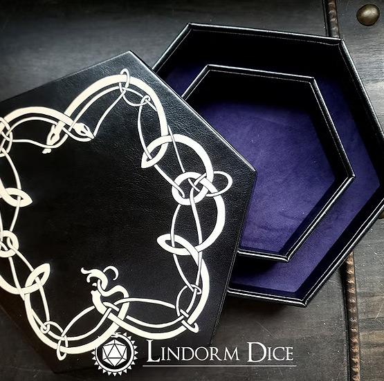 This is a sturdy dice tray in faux leather, lined with indigo purple felt. The tray has a compartment inside that makes it easier to sort your dice, while the lid can be used as a bigger tray. On the outside of the Lid is a big print of a knot made by a runic horse and serpent twirling around each other. The tray is 24 x 21 cm and 3,7 cm high.