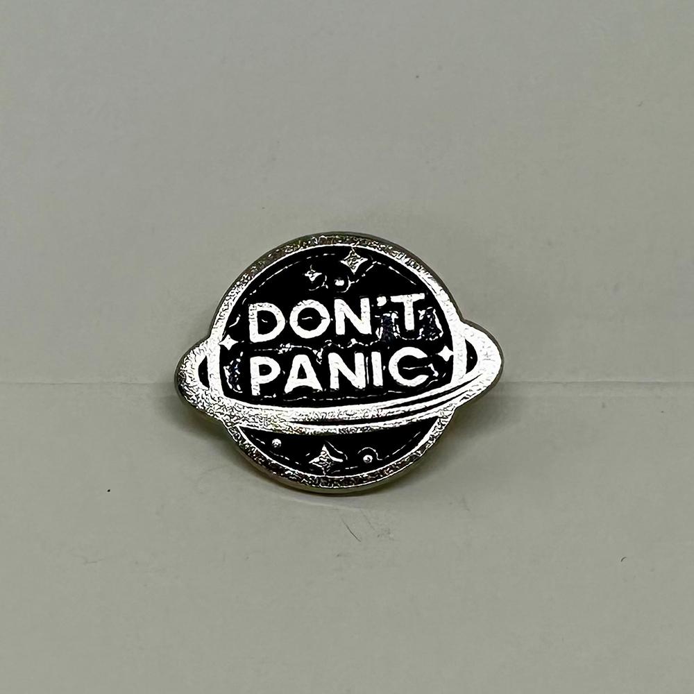 Emaljpin med det ikoniska Don't panic från Liftarens guide till galaxen.