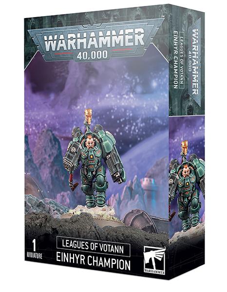 Seasoned commanders of the Hearthguard tasked with leading from the front, Einhyr Champions wear modified exo-armour fitted with mass drivers. Combined with their formidable close-quarters weaponry and bulky RAM shields, this hulking war-suit transforms them into living battering rams whose accelerated charge hits hard enough to smash clean through armoured fortress gates.