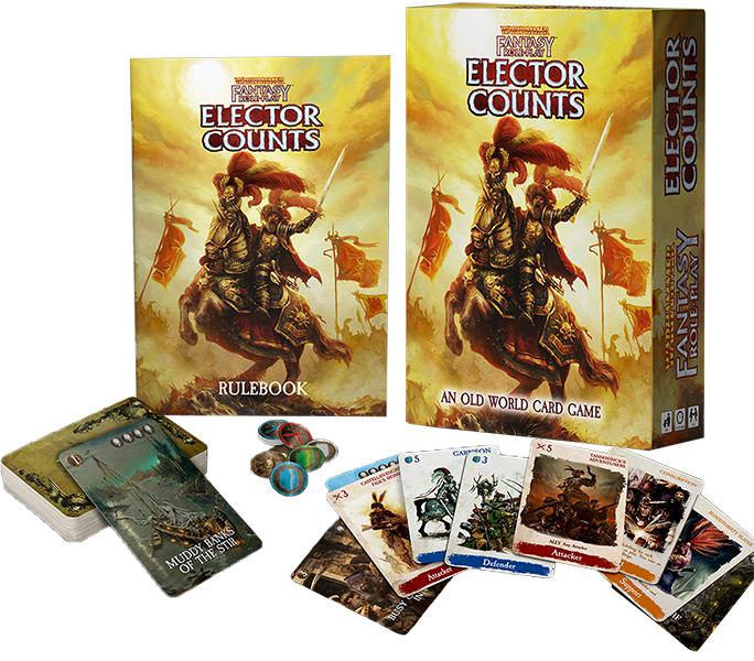 We are delighted to announce an exciting new Warhammer Fantasy Roleplay card game for 2–4 players, Elector Counts contains everything you need to vie for control of the Empire. This box contains a set of English rules, 112 game cards, a set of tokens and a player aid card. Designed to mimic the card games enjoyed by ruffians, gamblers and adventurers in inns and taverns across the Empire, Elector Counts is the perfect companion game to enjoy between your adventures in the Old World. The cards are gloriously illustrated in art new and old, with iconic pieces joining novel depictions of the loyal soldiers, iconic locations and famous personages of the Empire.