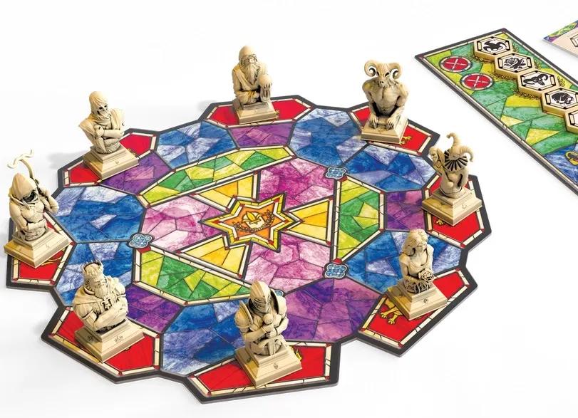 Enthrone is an abstract, two-player deduction game. The roughly octagonal, diecut board is ringed by 8 beautifully crafted figures, busts representing the potential heir to the throne; the reigning King, the Priestess, the Knight, the Jester, the Demon, the Assassin, the Archer and the Wizard.