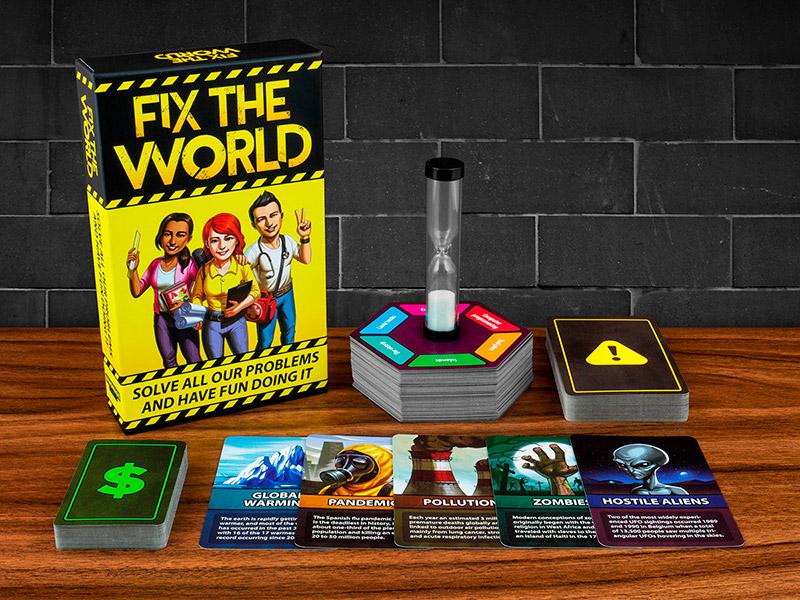 I Fix the World försöker 3-6 spelare pitcha utanför boxen-lösningar till stora världsproblem. Det finns dock en hake, de måste basera sina idéer på två slumpmässigt utvalda nyckelord, något som gör uppgiften betydligt svårare och mycket roligare.
