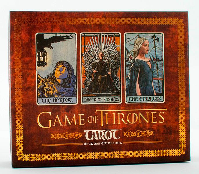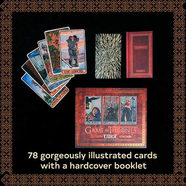 Includes 78 gorgeously illustrated cards and hardcover guidebook: This deluxe box melds the tradition of the tarot with the deep archetypes of Game of Thrones. Each card, from the Major Arcana to the Cups, Coins, Spears, and Swords of the Minor Arcana, offers a rich and meaningful experience. Game of Thrones fans will pore over a treasure trove of much-loved characters, scenes, and stories from the mega-hit television show depicted in a style both surprising and true to the world of Westeros. An accompanying hardcover booklet explains the symbolism of each card and how to use them in a tarot reading.