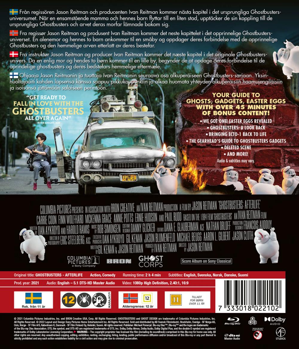 Från regissören Jason Reitman och producenten Ivan Reitman kommer nästa kapitel i det ursprungliga Ghostbusters-universumet. I Ghostbusters: Afterlife: När en ensamstående mamma och hennes två barn kommer till en småstad, börjar de upptäcka sin koppling till de ursprungliga spökjagarna och det hemliga arvet som deras morfar lämnade vidare. Filmen är skriven av Gil Kenan & Jason Reitman.