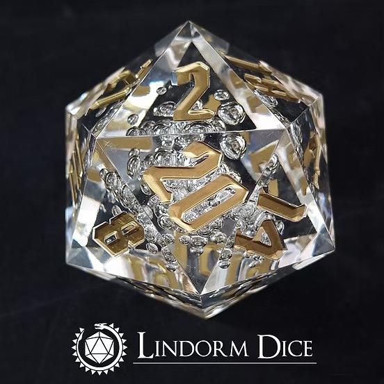 A giant acrylic D20 with gold numbers and lots of beautiful bubbles inside!