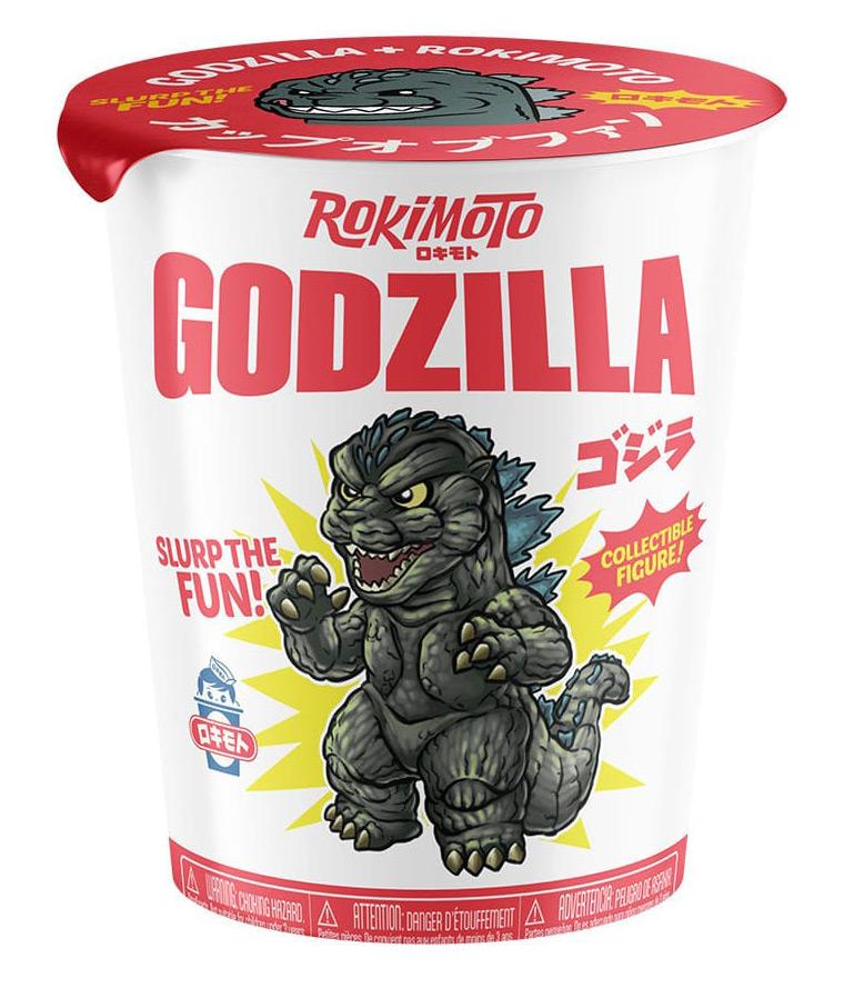 Bedårande söta figurer från Godzilla som slurpar i sig snabbnudlar.