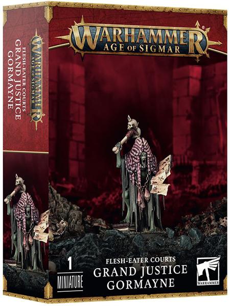 This multipart plastic kit builds Grand Justice Gormayne, a horrifying vampiric arbiter of the Flesh-eater Courts. Swinging a gore-streaked gavel fashioned from well-gnawed bones, the Grand Justice calls for order and cracks unruly skulls. He pronounces judgement on Ushoran's enemies whilst dressed in what he believes to be the finest robes and wig of office, reading ancient laws from a ragged 'legal tome'.