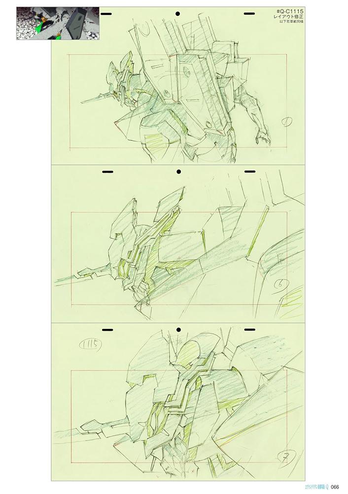 Original drawings and layouts from the second half and climax of "Evangelion: Q," the third film in the "Evangelion" series, which has taken a new turn under the leadership of the film's director Hideaki Anno.