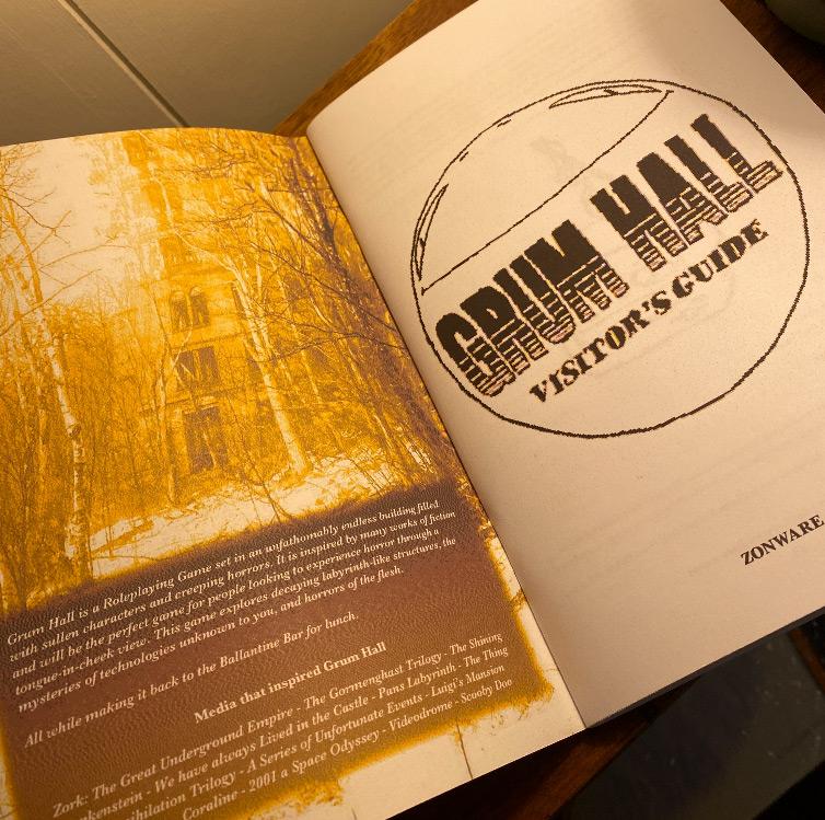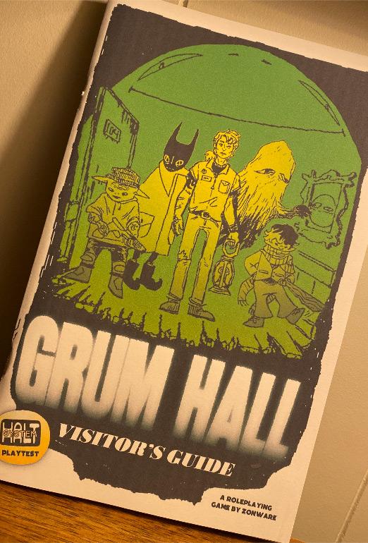 Described as "Scooby-Doo Horror"; Grum Hall is a tabletop roleplaying game set in a resort plagued by a creeping dread that snakes its way through the Hall’s very bones. The Hall has been run by a decaying super computer named Mora for decades now, and the once curious computer is becoming more chaotic and controlling by the day. Take up the mantle as a Maintenance Crew, accept jobs from the gaunt Bartender, and accompany sparking computer consoles throughout the endless halls of Grum. Your job is to upkeep Grum Hall, but the Hall may not like your meddling here.