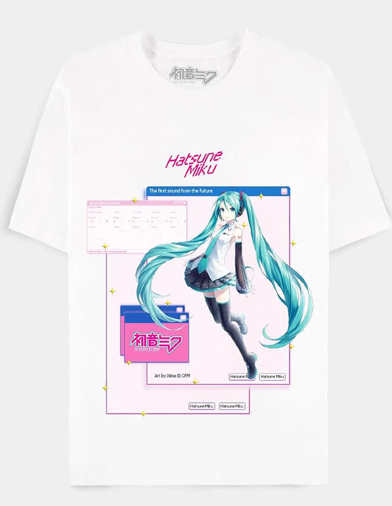 "The first sound from the future." Hatsune Miku som skärmpopup, på ren och fin tröja. Medium.