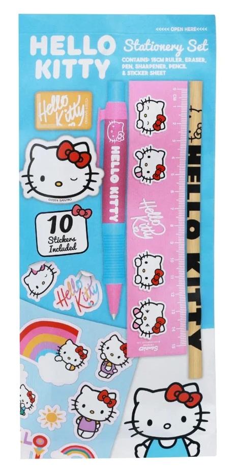 Innehåller klistermärken, en blyertspenna, en bläckpenna, en linjal, och två suddgummin.