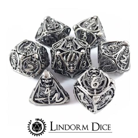 7 Piece metal dice set in a silver hue, shaped as skulls and rib cages framed by bone wings - these dice are hollow and therefor ligther than other metal dice. Sound bounces inside of them and if you roll them together you will hear a wonderful shiming sound