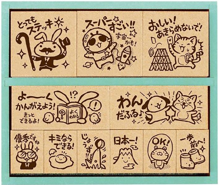 Fint stämpelset i trä med små söta figurer som ger uppmuntrande tillrop! Belöna läxläsning, prov, eller pryd din dagbok och kalender med glad uppmuntran. Man får tre stora, två mellanstora avlånga, och sex mindre stämplar. Undersidan är gjord av gummi.