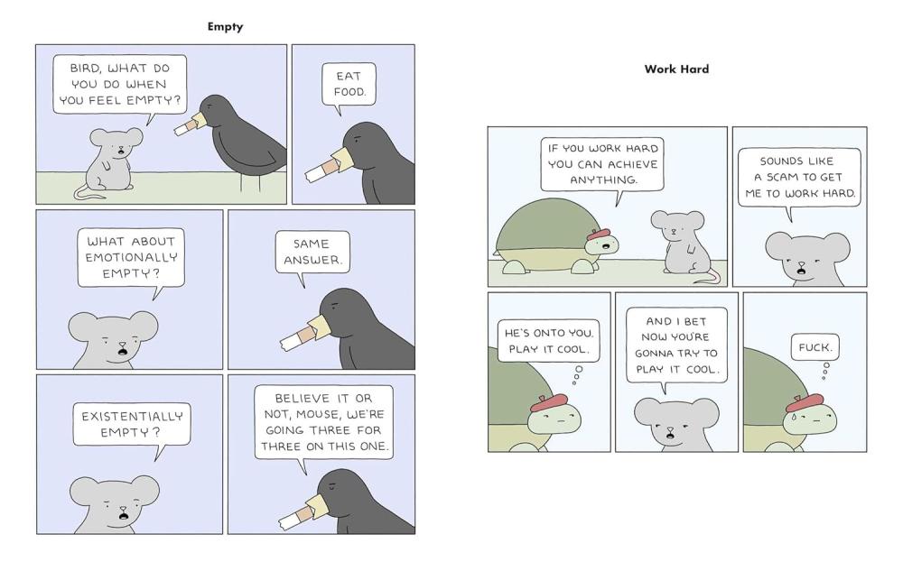 On the surface, the animals in Poorly Drawn Lines are sophisticated, decadent creatures — Turtle sports a beret, Snail wears shades, Bird smokes cigarettes, and Mouse assumes a fighting stance when anyone challenges his emotional fragility. But lurking beneath their surface images is a surprising warmth and charming naivete that provides the perfect setup for Reza Farazmand’s unparalleled sense of humor. This author-curated collection of new comics and greatest hits showcases the unique and charming world of these small animals and the amusing gap between their tough guy images and animal innocence. Familiar to millions of readers of the Poorly Drawn Lines webcomic and FX animated series on Hulu, this book collection includes dozens of never-before-seen comics.