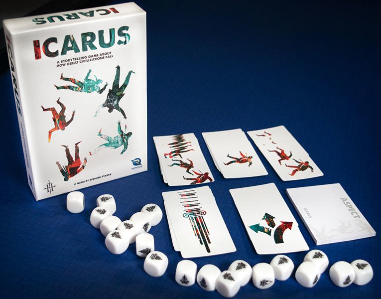 Icarus is a collaborative storytelling game about the collapse of a great civilization. Every game begins in a city-nation known as Icarus at the height of its power where, in celebration, the city has decided to erect a massive, ever-growing monument in the center of town to display its prestige to the world. During the game, you will be stacking dice to represent the construction of this monument, drawing cards from a story deck to create the escalating events in the city, and influencing the outcome of those events through actions driven by your characters motives. And when the dice tower finally falls, your civilization falls with it and the game comes to an end.