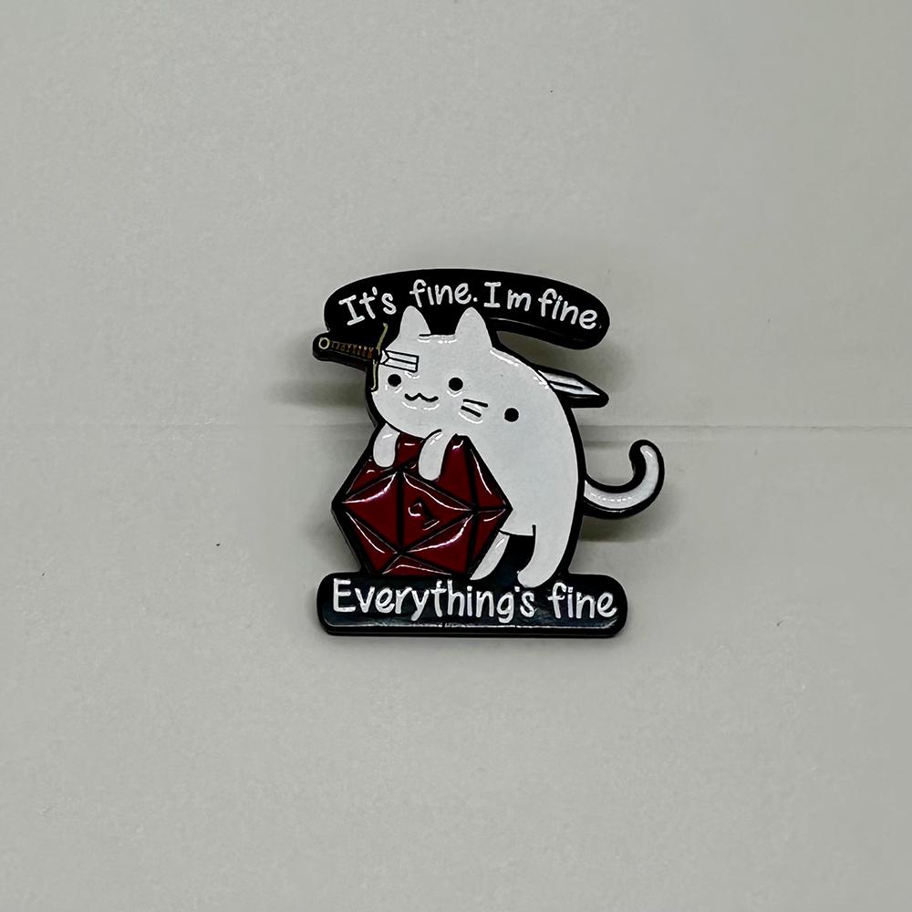 Emaljpin med en svärdsspetsad katt som hänger över en tärning, med texten It's fine. I'm fine. Everything's fine. #mood