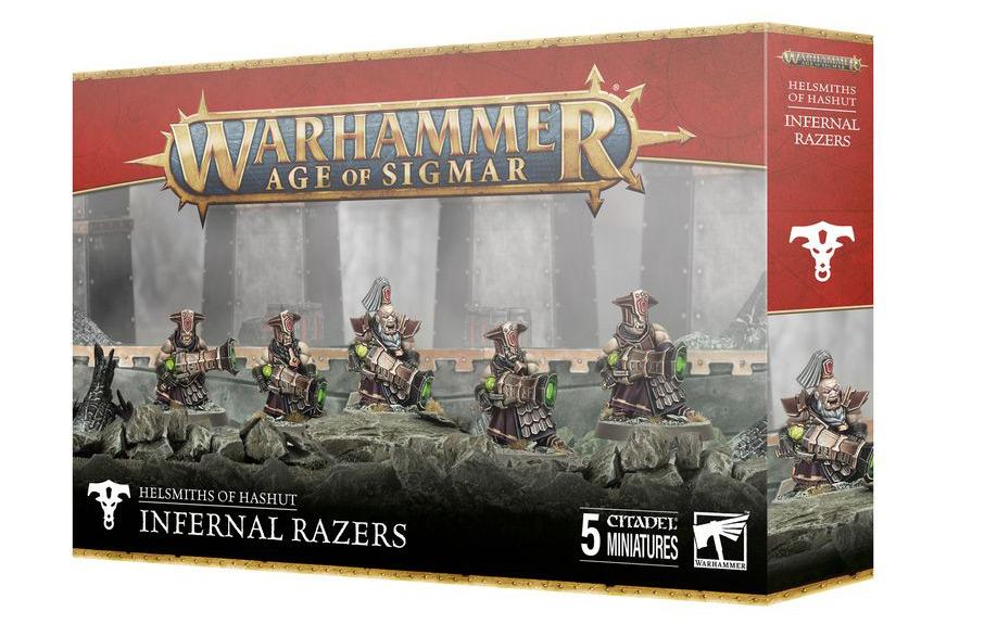 This multipart plastic kit builds five Infernal Razers, infantry wielding heavy firepower for your Helsmiths of Hashut armies in games of Warhammer Age of Sigmar. Heavily armoured and equipped with devastating Grizmalok blunderbusses or light infantry-roasting Karagthrun flamehurlers, they are ready to protect vital objectives and deal death from afar. The kit also includes parts to build an optional champion for your unit of death-dealing warriors.