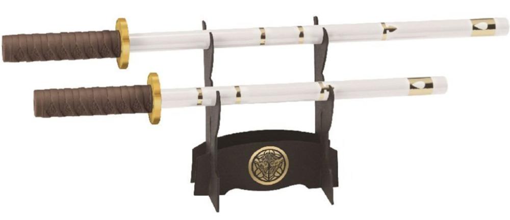 Set med två blyertspennor som ser ut som samurajsvärd och medföljande traditionell svärdsställning. Svärdspennorna är vita med bruna fästen och den medföljande ställningen bär den berömde krigsherren Uesugi Kenshins symbol.