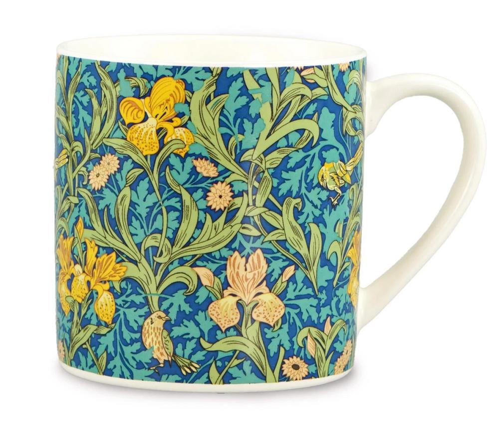 Mugg för uppiggande dryck, prytt av klassiskt blommotiv.