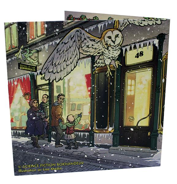 Mysigt utstansat julkort med kuvert, exklusivt tecknat för Science Fiction bokhandeln av serietecknaren och illustratören Lisa Medin.